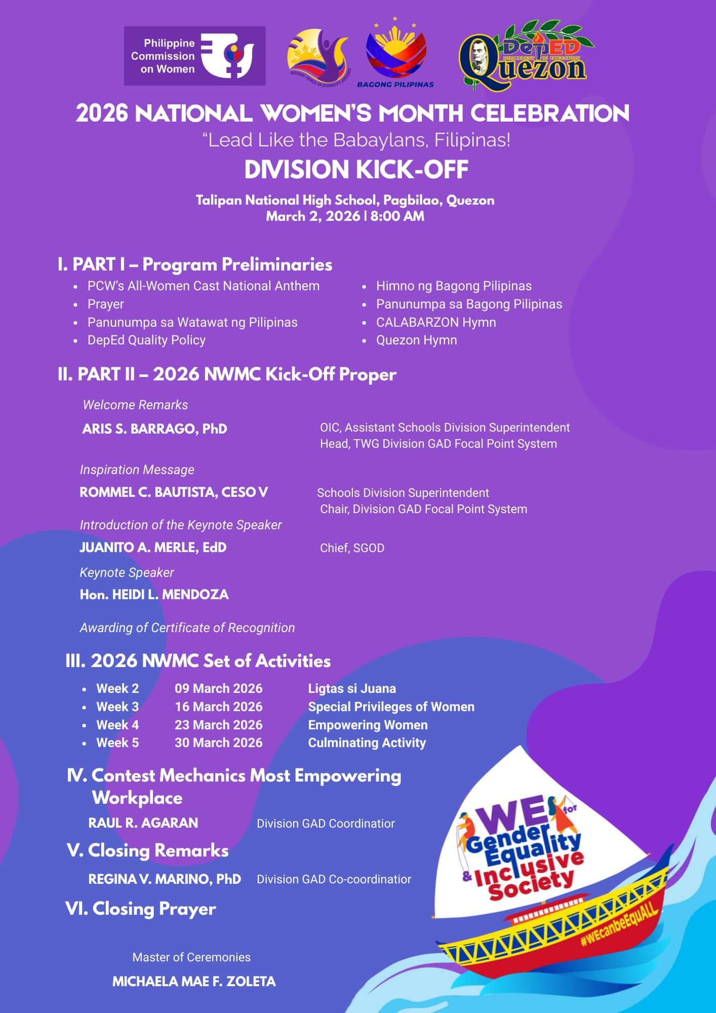 TALIPAN, QUEZON — The Schools Division Office of Quezon (SDO Quezon) officially launched its 2026 National Women’s Month Celebration on March 2, 2026, at Talipan National High School, gathering education leaders, personnel, and youth advocates in a united call for empowered Filipina leadership a... Read More >>