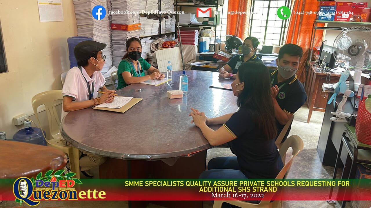 DepEd Quezon through the SGOD-SMME in coordination with Dr. Joan Alejaida Mauhay, EPS in-charge of private schools, commenced with the conduct of inspection of private schools requesting for additional strand in their current Senior High School (SHS) offerings, March 16-17, 2022. SEPS Oscar Duma Jr... Read More >>