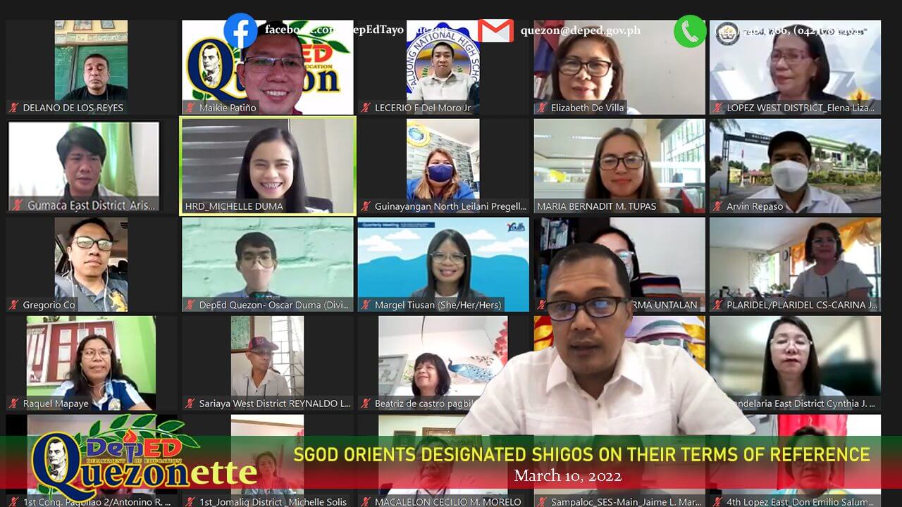 To streamline its processes and reporting systems on governance and operations, DepEd Quezon through the School Governance and Operations Division (SGOD) designated a School Head in-charge of Governance and Operations (SHIGO) per schools district and conducted an orientation program via Zoom, March ... Read More >>