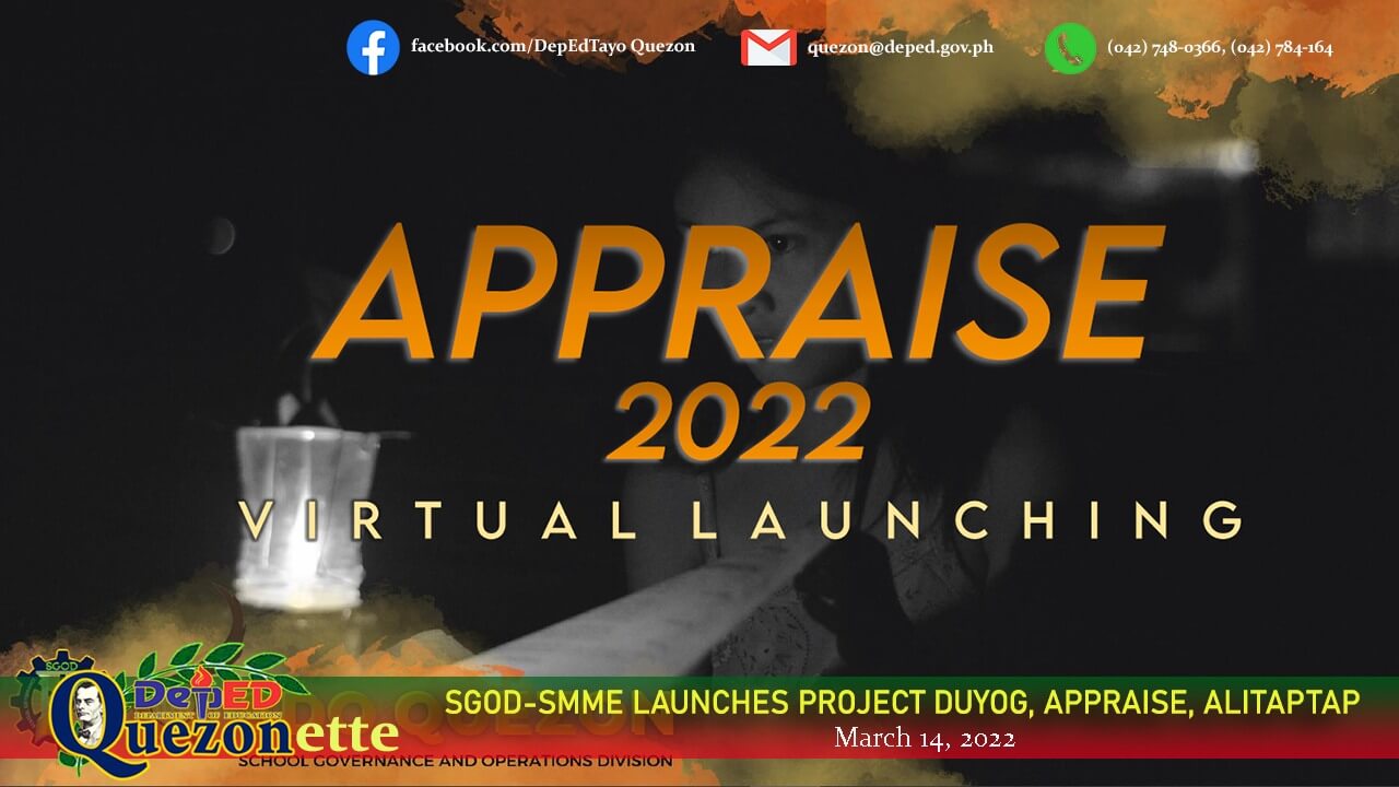 To officially acquaint SDO Quezon with the major projects of the School Governance and Operations Division (SGOD), the School Management Monitoring and Evaluation (SMME) Section in coordination with the Division Information Officer (DIO) and the Press Release and Field Correspondents (PREFIC) Team, ... Read More >>