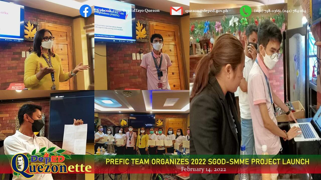 In order to finalize preparations for the launch of 2022 Project APPRAISE (Applying Results-Oriented Assessment for Improved School Effectiveness, the Division of Quezon's School Governance and Operations Division-School Management Monitoring and Evaluation (SGOD-SMME) conducted a limited face-to-face planning meeting and workshop at Sevilla's Farm and Resort, Lucena City last February 14. Guided by the Division Information Officer, SEPS Oscar R. Duma, together with EPS II Bernadit M. Tupas, the Press Release and Field Correspondents (PREFIC) finalized the set of activities and needed materials for the said event. Based on the pre-planning meeting via Zoom last February 7, the team presented the planning outputs with the help of PREFIC President, Edmond J. Malihan of Guinayangan Elementary School, Guinayangan South District. "Project ALITAPTAP (Advancing Leaders’ Information Technology Advocacy for the Public), a component of Project APPRAISE, is aligned with the Information Leaders Award (ILAW) of DepEd. The virtual launch will also include the 2022 PAPs Festival to showcase the schools/districts’ exemplary programs, activities and projects on governance and operations in support to curriculum implementation," said Duma. Duma also discussed the role of the PREFIC Team as part of information sector of the SDO-Quezon and mobilization through information dissemination on DepEd Tayo Quezon Facebook Page. Other matters were also explained, including recruitment of additional members to represent the four congressional districts of Quezon, certifying contributors, managing article contributions, and creating members’ identification cards. In support to the said projects, Elizabeth M. De Villa, SGOD Chief, expressed her encouragement, and provided technical assistance to the group. She sponsored the PREFIC Team’s shirt as well. Charisse Joyce D. Enriquez PREFIC Pioneer | Bilucao Elementary School | Sampaloc District