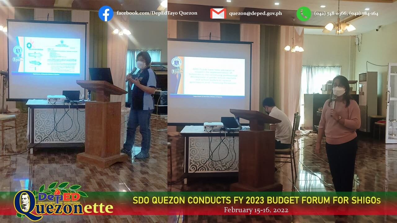 With reference to DBM National Budget Memorandum No. 142, dated January 12, 2022, or the National Budget Call for FY 2023, DepEd Quezon Implemented a limited face-to-face Division Budget Forum which was attended by designated School Heads in-charge of Governance and Operations (SHIGO) at Sevilla's Farm and Resort, Lucena City, February 15-16. Participants were oriented on the salient features of said Memorandum in preparation for the crafting and submission of the FY 2023 budget proposals of the schools. The event was also attended by Division Personnel, including the Budget Officer Catherine Pureza, Planning Officer Marbin Jeramil Fragata, OIC-Accountant Edmundo Marin Jr., HRD-SEPS Regina Marino, and Nurse in-charge Ma. Teresita Abella. OSCAR R. DUMA JR. SEPS | DIO | PREFIC