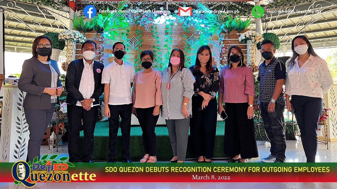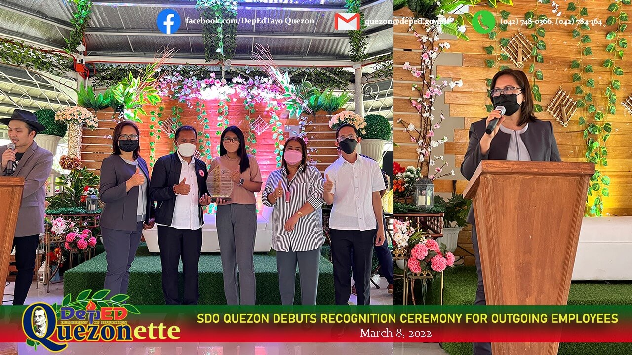 The Department of Education Schools Division Office – Quezon (DepEd SDO Quezon) held its first Rewards and Recognition Ceremony for its promoted employees, vis-à-vis a program on the National Women’s Month Celebration at M.I. Sevilla’s Farm and Resort, Lucena City, March 8. In his speech, Schools Division Superintendent Elias A. Alicaya Jr. shared, “Alam ko ang pakiramdam na minsan, aalis ka sa isang organization na para namang hindi ka napasalamatan kahit ilang taon kang nag-spend doon sa trabaho. Ang tagal-tagal ng serbisyo mo doon pero in the long run, nag-retire, umalis ka, nag-transfer ka, ni ‘ha,’ ni ‘ho’, wala man lang.” With this, the SDS intended to express appreciation for the outgoing employees of the Division by initiating a short R&R program, in addition to other operational programs related to promotion, reclassification, and claims and benefits for its personnel. As part of the on-the-spot category of the fifth-time Gawad Gintong Binhi facilitated by the School Governance and Operations Division - Human Resource Development (SGOD-HRD), this onsite program sought to recognize the teaching and non-teaching personnel who rendered exemplary services, outstanding accomplishment, good deeds, and noteworthy behavior, thus motivating and inspiring other DepEd Quezon personnel, not only to continue to improve the quality of their performance but also to be a role model and inspiration to every Quezonian. Assistant Schools Division Superintendent (ASDS) Gregorio T. Mueco congratulated the SGOD, led by Chief Elizabeth de Villa for launching a “very worthwhile activity” acknowledging the achievement of the men and women of the Division of Quezon, especially those who have been promoted and who have been transferred to other stations within and outside the Division. SGOD Chief De Villa mentioned: “This is a shared responsibility of the Department of Education Division of Quezon to honor you, my dear colleagues, in your performance rendered last year. That’s why our Schools Division Superintendent, Sir Eli [Alicaya], organized this activity and told us to be part of this GAD (Gender and Development) activity.” This ceremony also coincided with the culmination of DepEd Quezon’s National Women’s Month Celebration spearheaded by the Division GAD Focal Point System, considering that 83 percent-majority of the awardees were women. Having received plaques of recognitions for rendering exemplary service towards achieving quality management in the Division, this year’s awardees were 18 previous employees of SDO Quezon, namely: Hannah Irish R. Cañeda (Legal); Dayanara E. Flores, Raquel O. Venzuela, Aireene U. Morales. and Yvannah Marie A. Ingente (Personnel); Jean O. Solomon (Supply); Ronald M. De Ramos, Donald M. Fontanosa, Mildred E. Glorioso, Amiecel A. Hutalla, Czarina Gaye J. Mendiola, Zara Jessica D. Pasta, Maychelle A. Te, Sharon M. Venzuela, Jessica M. Tolenada, and Z-Anne Leah B. Zulueta (Accounting); Rhodora T. Peña (Budget); and Zaldy O. Bueno (former Youth Formation Unit coordinator). During the event, one of the awardees, Dr. Z-Anne Leah B. Zulueta (former Administrative Assistant III of DepEd Quezon and current Administrative Officer II of DepEd Lucena City), said: “This [award] is an extra special bonus po para po sa amin kasi mas mahalaga sa amin ‘yung mga natutunan namin throughout the years… We will always be thankful and grateful sa DepEd Quezon, and DepEd Quezon will always have a special place in our heart. Maaasahan ninyo po that we will continue to do what we did dito sa Quezon.” The event concluded as SDS Alicaya reminded everyone, especially the recipients, “Saan man padparin tayo ng mga paa natin, ang importante… walang inaapakang tao at taas noo kang aalis sa sa anumang organisasyon na ginawa mo ang part mo noong panahong nagseserbisyo ka.” #SulongEdukalidad #SDOQuezon #DepEdTayoQuezon #DepEdCALABARZON #RandR #Awarding #PromotedEmployees #GAD #ProjectAPPRAISE #ALITAPTAPAwards #PREFICteam Jeth Ysrael R. Manalo Contributor: Teacher I | Gumaca National High School | Gumaca West District Photos by: Braulio Ruelo Jr. | Talipan National High School | Pagbilao District 1