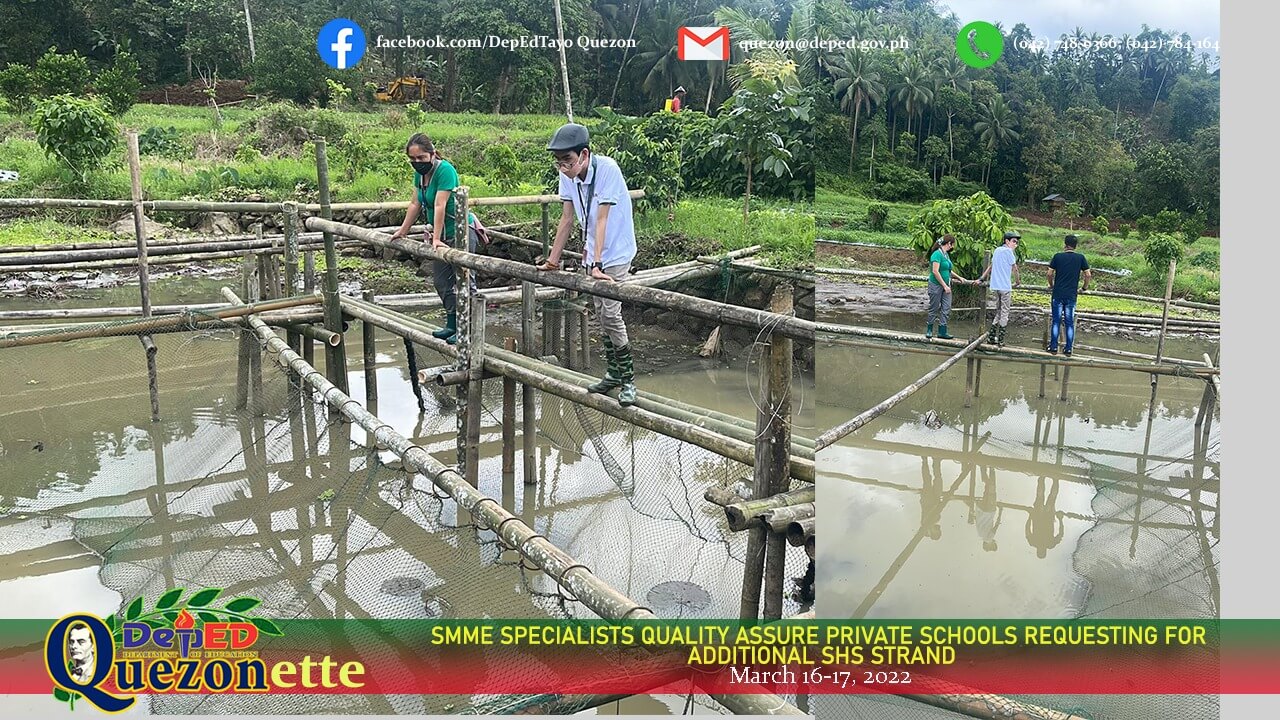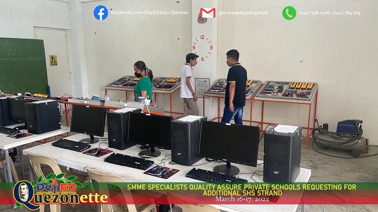 DepEd Quezon through the SGOD-SMME in coordination with Dr. Joan Alejaida Mauhay, EPS in-charge of private schools, commenced with the conduct of inspection of private schools requesting for additional strand in their current Senior High School (SHS) offerings, March 16-17, 2022. SEPS Oscar Duma Jr., together with EPS-II Maria Bernadit Tupas, led the quality assurance of the following schools: 1) Banahaw Technological College Inc., Lucban (applying for Agri-Fishery Arts); Manuel S. Enverga Academy Foundation, Inc., Sampaloc (applying for HUMMS); Saint Peter School Calauag (applying for STEM); and Philtech Institute & Arts Technology, Catanauan (applying for ABM). Inspection was guided by the pre-evaluated documents of said private schools. Recommendations made by the members of the Division inspectorate team will be forwarded to the EPS in-charge of private schools for submission and final evaluation of the Regional Office. The remaining schools are set for inspection in the following quarter. +++ #SulongEdukalidad #DepEdCALABARZON #SDOQuezon #DepEdTayoQuezon #parasabataparasabayan #privateschoolsinspection #SeniorHighSchool #ProjectAPPRAISE #ALITAPTAPAwards OSCAR R. DUMA JR. SEPS | DIO | PREFIC