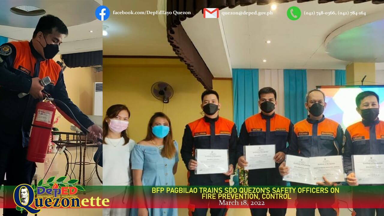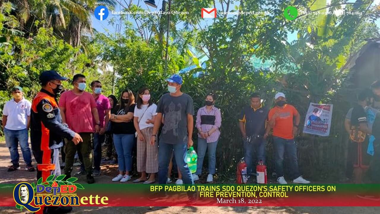 In view of the Annual Fire Prevention Month this March pursuant to Republic Act No. 9514 (Fire Prevention Code of the Philippines), DepEd Quezon in partnership with the Bureau of Fire Protection (BFP) Pagbilao conducted a fire prevention and control training for the SDO’s safety officers per section/office, Sevilla’s Resort Lucena City, March 18. Insp. Jonathan R. Albos, Acting Municipal Fire Marshal, discussed the training’s objectives and gave important safety tips to the participants. SFO4 Jonathan M. Husana, Fire Safety Enforcement Section Chief, shared about fire incidents and school safety; while SFO2 Reynan G. Veluz, Fire Safety Inspector, enumerated the steps to take to attain fire safety at home and in the workplace. Other topics with drills and practice were also delivered: SFO1 Lloyd P. Martinez, Fire Control Operation Chief, on extinguishing fire; and FO3 Arvin C. Daluraya, Station Nurse, on first aid and basic life support. Arvin Repaso, Division DRRM Coordinator, highlighted the importance of readiness and learning fire prevention and control at the workplace. +++ #SulongEdukalidad #DepEdCALABARZON #SDOQuezon #DepEdTayoQuezon #parasabataparasabayan #BFP #BFPPagbilao #FirePrevention #ProjectAPPRAISE #ALITAPTAPAwards OSCAR R. DUMA, JR. SEPS | DIO | PREFIC