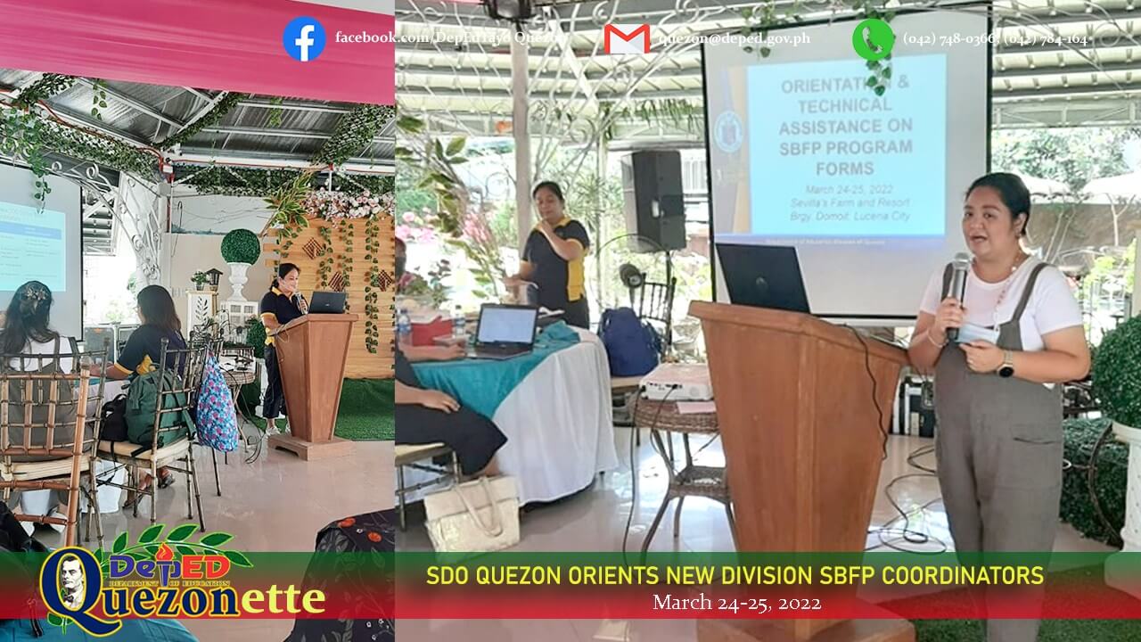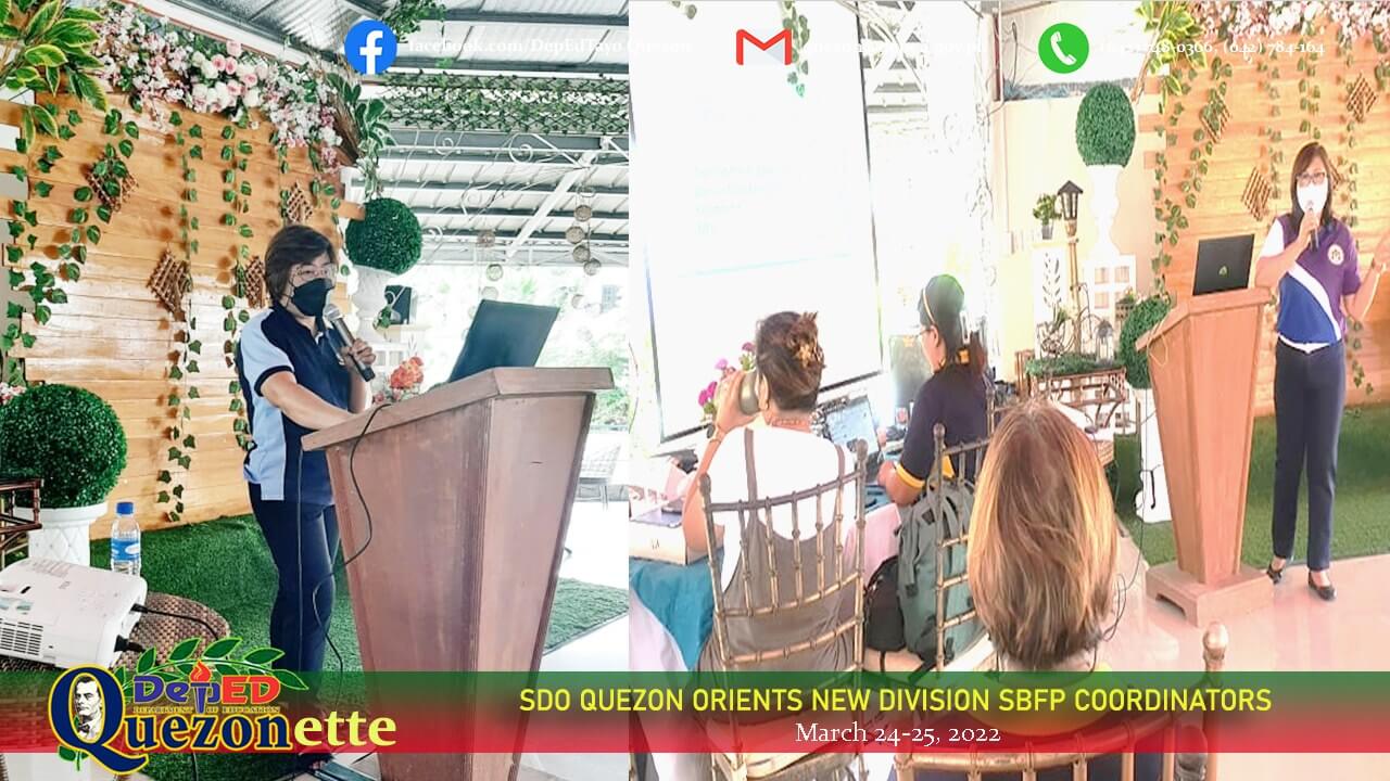 DepEd Quezon through the initiative of the SGOD- School Health Section conducted an orientation for the newly designated School-Based Feeding Program (SBFP) coordinators at Sevilla’s Farm and Resort, Lucena City, March 24-25. The activity was participated by select district nurses per congressional district who will be in-charge of the Nutritious Food Products and Milk Component of the SBFP. It aimed to provide information and technical assistance to all new members of the SBFP Technical Working Group responsible as TA providers in the implementation of the program. Also, the orientation served as an avenue to have a common understanding on the different issuances, guidelines and policies, discuss issues and concerns encountered from the previous implementation, and find ways and solutions for better implementation. This fiscal year, the implementation of the SBFP shall commence from April-June 2022 using the FY 2022 budget allocation from the General Appropriations Act (GAA). With the Special Allotment Release Order (SARO) released to the SDO, DepEd Quezon identified the beneficiaries following DepEd Order No. 010, s. 2022 and other preliminary program forms requisite before the start of feeding. With the new composition of the SBFP Team from 1st to 4th districts, Nurse Maria Nerissa A. Diego discussed the detailed process flow in the SBFP implementation and all the legal bases from SY 2014-2015 up to SY 2021-2022. The mechanics and guidelines relevant to allowable operational expenses downloaded to each school recipient were also tackled. To monitor the progress report and status of implementation per school implementer, Nurse Jackielyn Mae N. Ebora, Division SBFP Alternate Focal Person for MFC discussed the different program forms using the innovated Google Form for SBFP reporting. Each item was explained in detail as to its completeness and what to encode. With the issued supplemental guidelines on DepEd Order No. 31, s. 2021, Nurse Nessan Ingrid L. Rapada, Division SBFP Alternate Focal Person for NFP discussed the updates and revisions on the technical specifications of food commodities and the scope and coverage of learners to be included in the feeding program. Other activities were also discussed relevant to the program implementation. The highlights of the SBFP implementation in accordance with DO 31, s. 2021 were reiterated by the Division SBFP Focal Person NIC Ma. Teresita M. Abella to guide the new members of the team for a common understanding. Action plan for the SBFP FY 2022, Cash Program, Work and Financial Plan, PPMP, APP, were also presented for transparency, information and reference. The monitoring schedule and TA were also planned for onsite visitation during the implementation of both Nutritious Food Products and Milk Feeding Component. The activity, which is in support to the expanded limited F2F classes in the Division, was graced by OIC-SDS Elias A. Alicaya Jr. and the ASDSs. The same support was expressed by SGOD Chief Elizabeth M. De Villa and Dr. Marie Antoinette A. Tesalona, Head of the School Health Section. +++ Ma. Teresita M. Abella, RN Contributor | Nurse II | Division SBFP Focal Person
