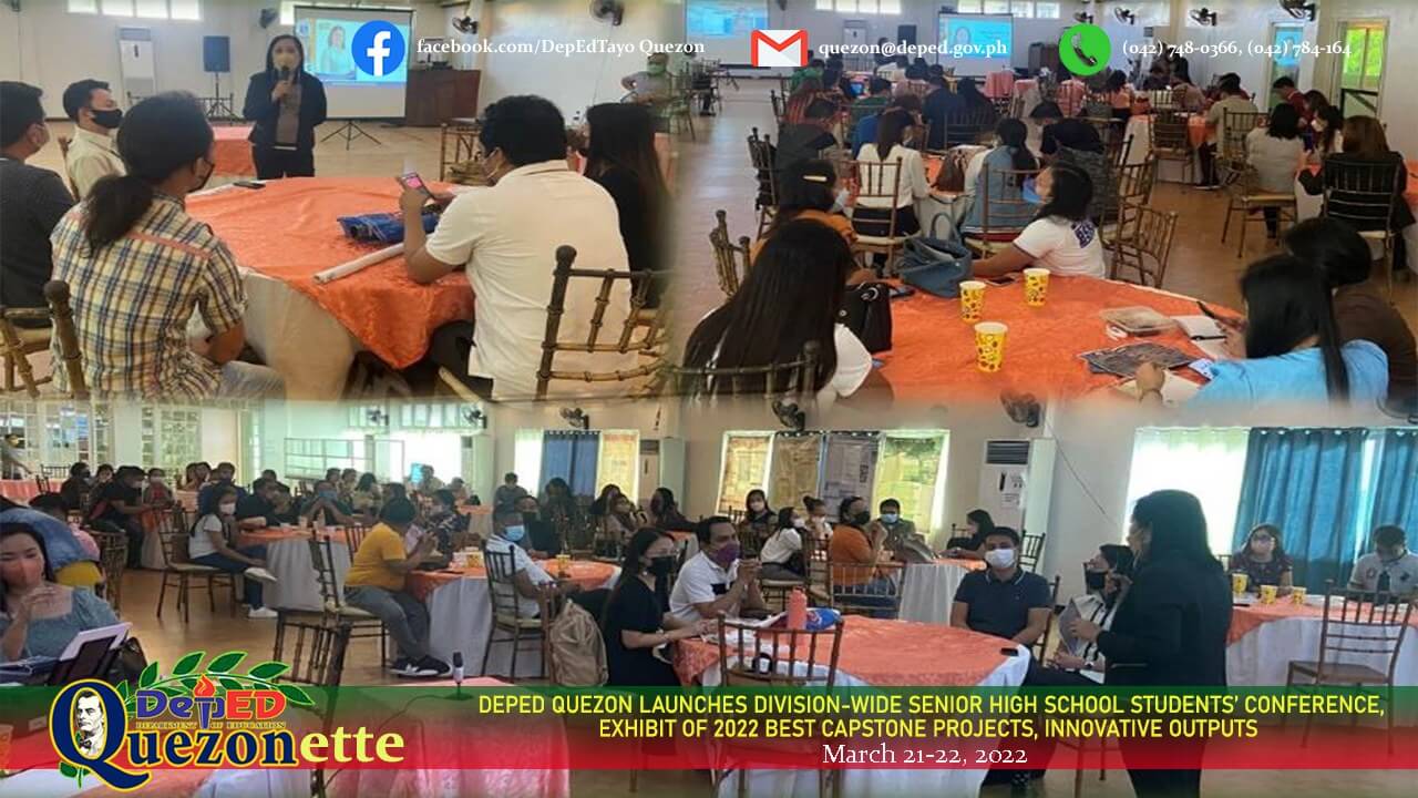 To continuously improve the implementation of the Senior High School Program, the Schools Division of Quezon, through its CID Project BLAZE (Building Learners’ Authentic Zeal of Excellence) conducted a Division-wide Senior High School Students’ Conference and Exhibit of Best Capstone Projects and Innovative Outputs at MI Sevilla’s Farm and Resort at Brgy. Domoit, Lucena City, March 21- 22. The event is part of SDO Quezon’s earnest desire to address the issues and concerns confronting the Senior High School students as well as the Curriculum and Implementation Program in the division. It also aims to present quality capstone projects and innovative learning outputs accomplished by the Senior High School learners in Deped Quezon for benchmarking. Dr. Lorena S. Walangsumbat, Curriculum Implementation Division Chief, delivered the welcome remarks and acknowledged the role that teachers play in the curriculum implementation as well the effort of the Division in ensuring that the needs of senior high school are addressed well. She also stressed that the tablets are expected to have been delivered for students’ use in their daily learning tasks. Mr. Gregorio T. Mueco, Assistant Schools Division Superintendent, ASDS In-Charge of the CID shared an inspiring message to the students and teachers. He further added that it is one of the best opportunities to benchmark and share best practices after a few years of temporary school closure. Dr. Guadalupe C. De Jesus, Master Teacher II and President of the Senior High School Division Coordinators’ Organization (SHS D’ Co.), shared the Rationale of the event and then proceeded with the introduction of Dr. Juanito A. Merle, for the status of the SHS in DepEd – Quezon. Meanwhile, Dr. Juanito A. Merle, Education Program Supervisor/ Division Senior High School Focal Person, welcomed the participants and presented the Status of DepEd Quezon Senior High School (SHS) Program with actual data gathered from SHS schools together with the DepEd Orders and Memoranda relative to SHS implementation. As one of the highlights of the activity, learners were given the chance to voice out issues and concerns as well as suggestions and recommendations for the continuous improvement in the instruction in the Senior High School in all Congressional Districts of the Division. The SHS Coordinators’ Organization Officers through Dr. Marilou Maas, master Teacher II and SHS D’Co. treasurer, facilitated a virtual small-group sharing on learner-participants’ suggestions and recommendations in the Senior High School Curriculum Implementation and Programs. To formally address the collated issues and concerns of the Senior High School program in DepEd Quezon from learner-participants of both days, Mrs. Asela Loreen V. Demdam, Master Teacher I and Secretary of the SHS D’ Co., led the crafting of the conference resolution on the second day for attention or necessary actions as deemed appropriate by the higher authorities. A visual poster exhibit as well as virtual presentations of best capstone projects and researches made by SHS learners from different Senior High Schools in DepEd Quezon was also part of the highlights of the conference. The conference marked its success as Dr. Juanito A. Merle, Education Program Supervisor and Division in charge of the SHS Program, challenged the participants to carry on with the best practices, find most creative solutions to address the problems and exercise critical and creative thinking skills in all Senior High School undertakings. He also presented the technical working group to the participants, namely: Dr. Guadalupe C. De Jesus, Sherwin I. Diala, Dr. Marilou D. Maas, Alexis P. Iglora, Danilla B. Lavilla Jr., Joel B. Casungcad, Jensen Ryan Lim, and Ronald B. Palamiano. Dr. Guadalupe C. De Jesus delivered the concluding remarks thanking the Top management, the students, the teachers as well as co-organizers for the hard work and team spirit shown in the event by saying that God’s timing is always perfect because the event unfolded a new venture for the students and teachers to collaborate with one another despite and in spite of the pandemic. +++ #SulongEdukalidad #DepEdTayo #DepEdTayoQuezon #DepEdCALABARZON #SHS