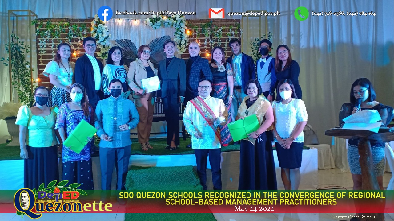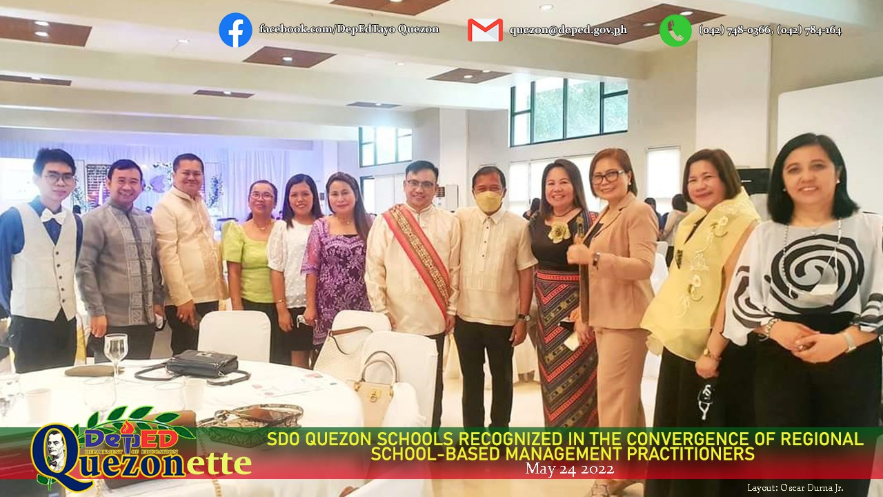 DepEd IV-A CALABARZON conferred Lutucan Integrated National High School and Alabat Island National High School as SBM Level III (Advanced Level of Practice) in the recently concluded Convergence and Recognition of SBM Practitioners at Ouan’s Farm Resort, Lucena City, May 24. SDO Quezon was delegated by Gregorio I. Racelis and Jessie V. Vasquez, the principals representing said schools, together with SDS Elias A. Alicaya Jr., CID Chief Lorena. S. Walangsumbat, SGOD Chief Elizabeth M. De Villa, SEPS and SBM Coordinator Oscar R. Duma Jr., EPS-II Maria Bernadit M. Tupas, PSDS-Alabat Rebie Marciano, PSDS-Sariaya West Carlito Gunay, and other guests from the school awardees. The program was officially started with the ribbon-cutting ceremony led by Regional Director Francis Cesar Bringas, as well as the SDSs and ASDSs of Rizal, Quezon, Cavite and Batangas clusters. The gallery walk on SBM best practices followed. SEPS Duma later presented the Division’s technical assistance initiatives on SBM. +++ #SBM #DepEdTayo #ProjectAPPRAISE #ALITAPTAPAwards #SDOQuezon